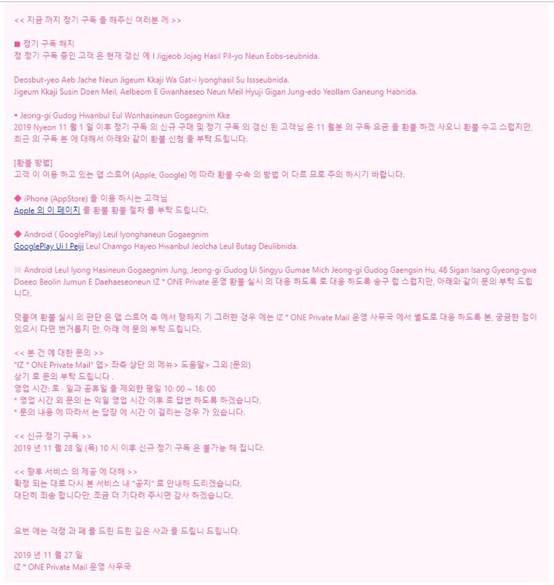 그런데 지난 27일 아이즈원 프라이빗 메일 앱이 "11월 28일 오전 10시부로 서비스의 신규 정기 구독 및 정기 구독의 자동 갱신을 중단한다"며 "정기 구독으로 자동 결제된 11월분의 구독료는 환불해주니 환불 신청해달라"고 공지했다.