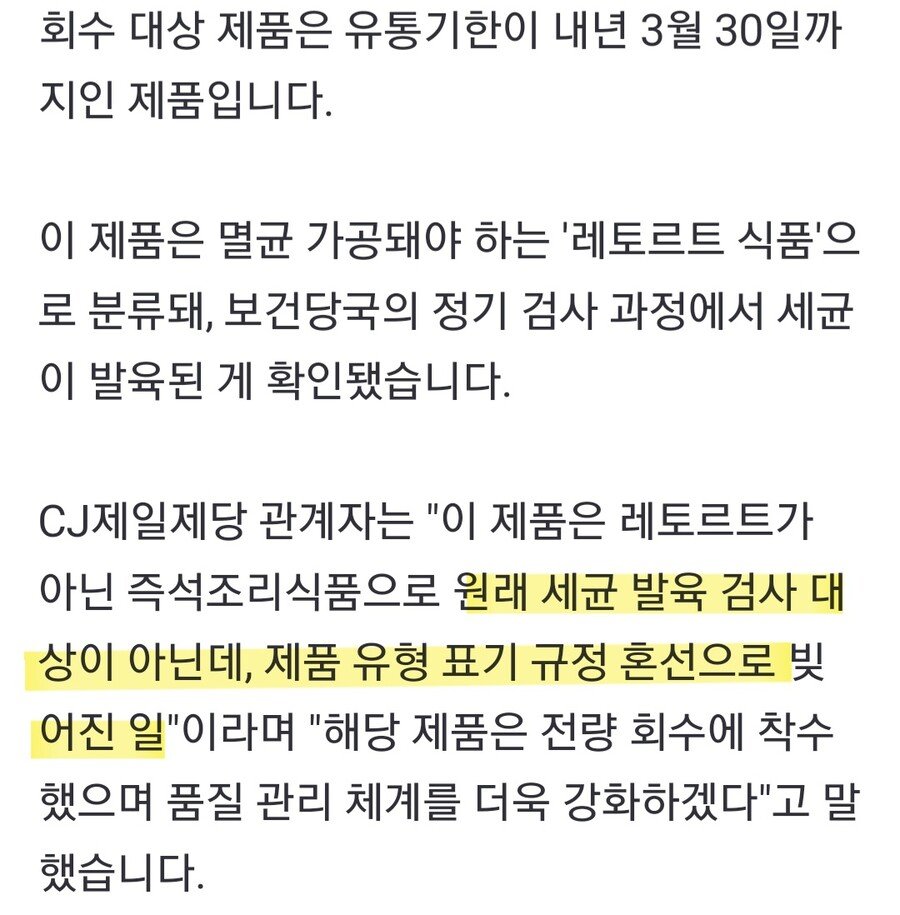 비비고 레트로 제품이 식약처 세균검사에서 걸린 이유