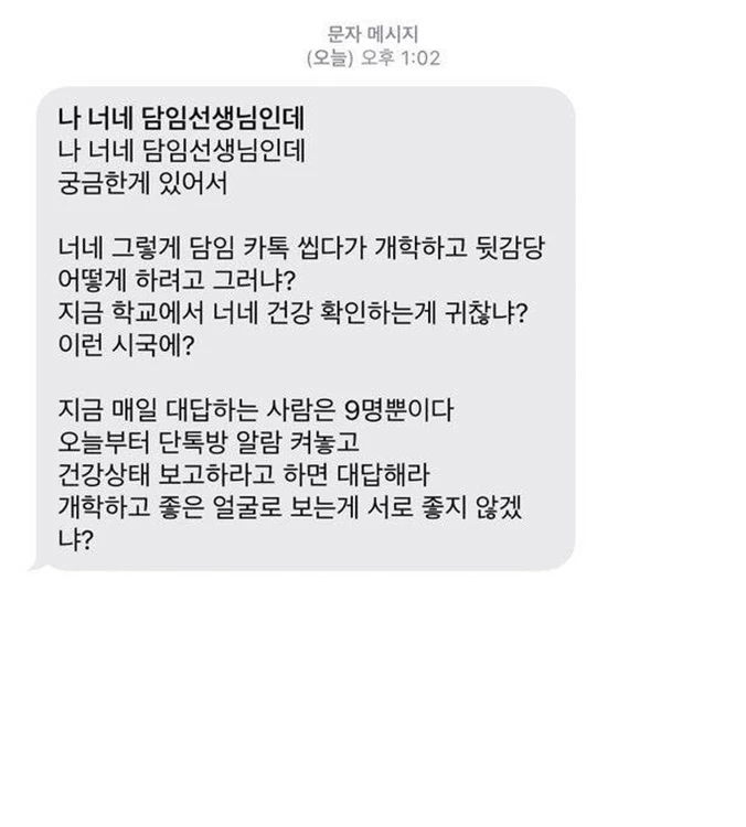 선생님은 "너네 그렇게 담임 카톡 십다가 개학하고 뒷감당 어떻게 하려고 그러냐? 지금 학교에서 너네 건강 확인하는 게 귀찮냐? 이런 시국에?"라고 몰아붙였다. 이어 "매일 대답하는 사람은 9명 뿐이다"라며 "건강상태 보고하라고 하면 대답해라. 개학하고 좋은 얼굴로 보는 게 서로 좋지 않겠냐?"라고 말을 마쳤다.