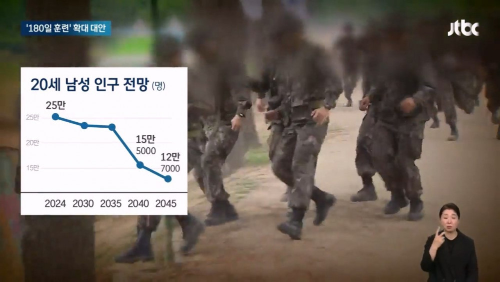 군대에 가는 20살 남성은 올해 25만 명에서 2040년 15만 5천명, 2045년에는 현재의 절반 수준인 12만 7천명으로 떨어질 것으로 추산됩니다.
