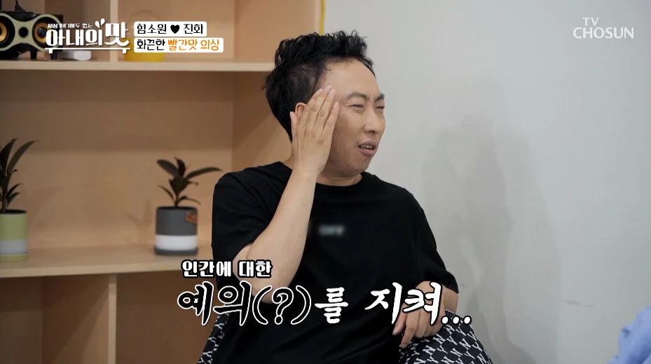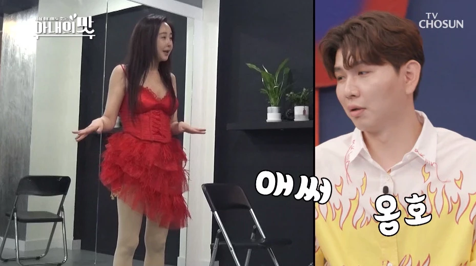 함소원은 본격 안무 연습에 앞서 파격적인 의상을 입고 등장했다. 노출이 심한 빨간색 원피스였다. 박명수 씨는 얼굴을 가리며 "일어나 소원아. 그러면 안 돼. 예의를 지켜"라며 손사레 쳤다.