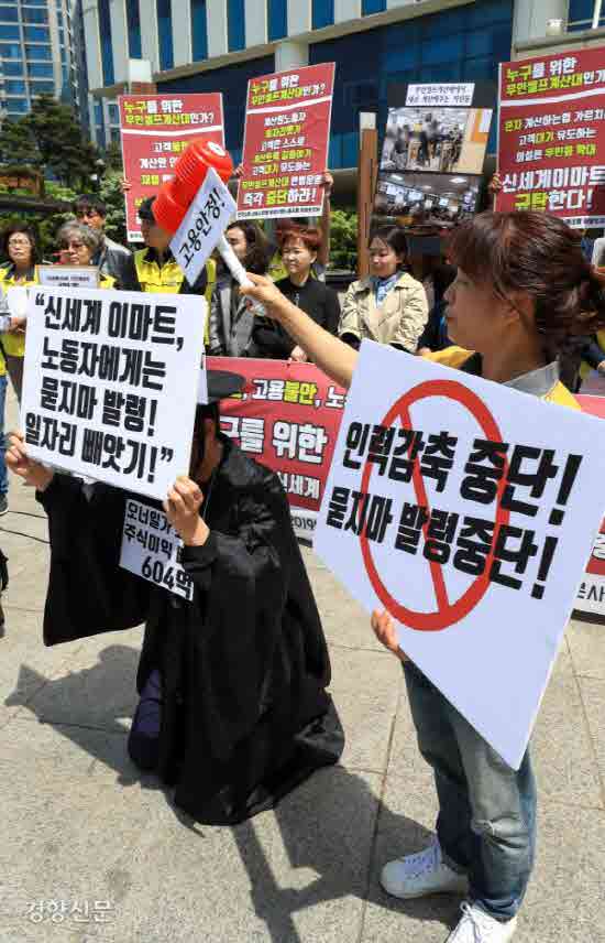 지난 5월 8일 이마트 노조원들이 서울 이마트 본사 앞에서 무인셀프계산대 확대 중단을 요구하는 기자회견을 열고 있다. 우철훈 선임기자