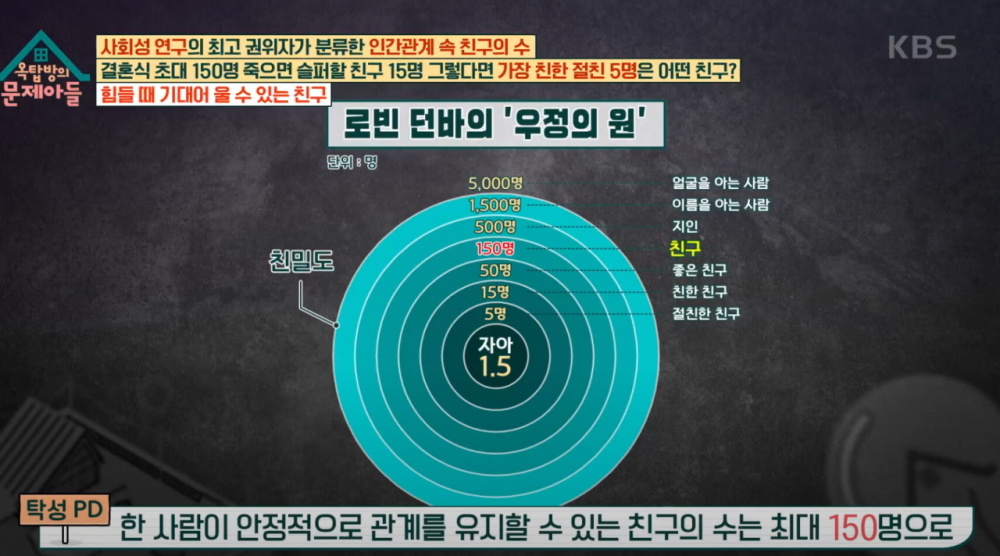 던바는 사람들이 일반적으로 친밀한 관계를 유지하는 친구는 약 5명, 좋은 관계를 맺는 친구는 약 15명, 지인이나 가족 등은 약 50명 정도라고 설명했습니다. 이러한 관계들을 종합하여 약 150명 정도의 숫자가 개인의 사회적 관계의 한계라고 주장했습니다